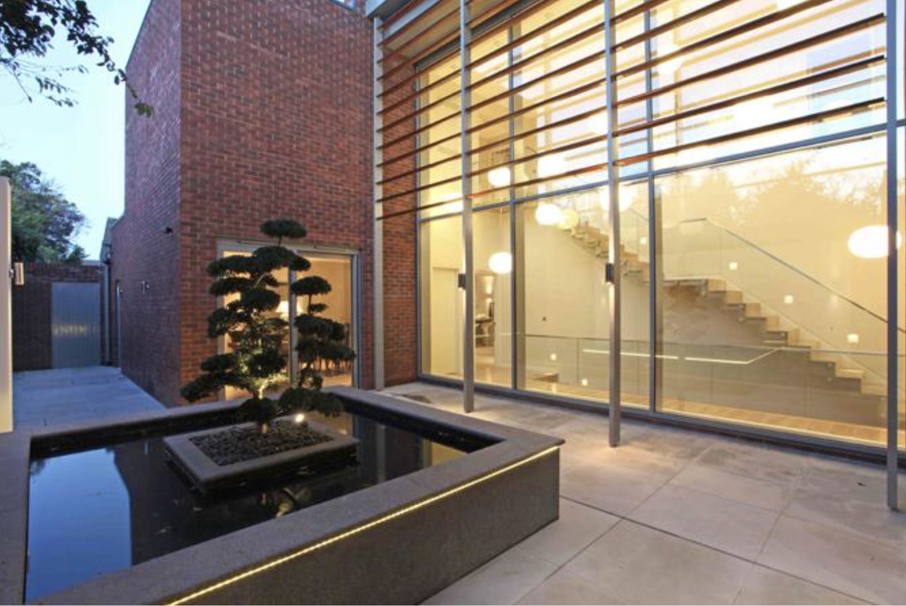 The Coach House project involved the rebuilding of an existing coach house building facing on to the street at the front of the site as a small lodge building and the construction of a new six bedroomed house behind this in an old walled garden area as the principal property on the site. The new building has been designed to provide simple but generous open plan living spaces with sliding glazed doors that open up onto the newly planted garden area. A particular feature is the open floating corner that can be created by opening the doors in the family room area, a feature that can also be created in the master bedroom on the first floor above. Built as a well-insulated construction with a concrete frame to provide thermal mass the house is designed to consume the minimum of energy. Rainwater is collected and recycled and power is provided by an array of PV panels mounted on the main flat roof area. Lower roof areas have a Sedum roof covering that will even out water run-off from the roof area and soften the outline of the building.